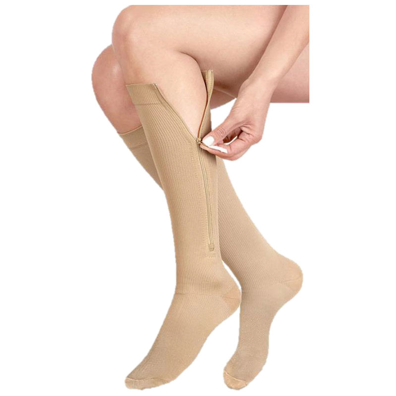 Las medias de compresión mediana con cierre o cremallera Zipper Socks previenen las venas várices y estimulan el descanso en las piernas ayudando a controlas las telangiectasias o arañitas..